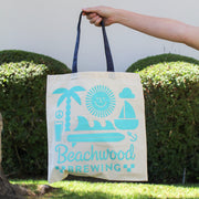 Beachwood tote bag perfect for summer! Made with 100% natural cotton, with navy straps and teal screenprinting.
