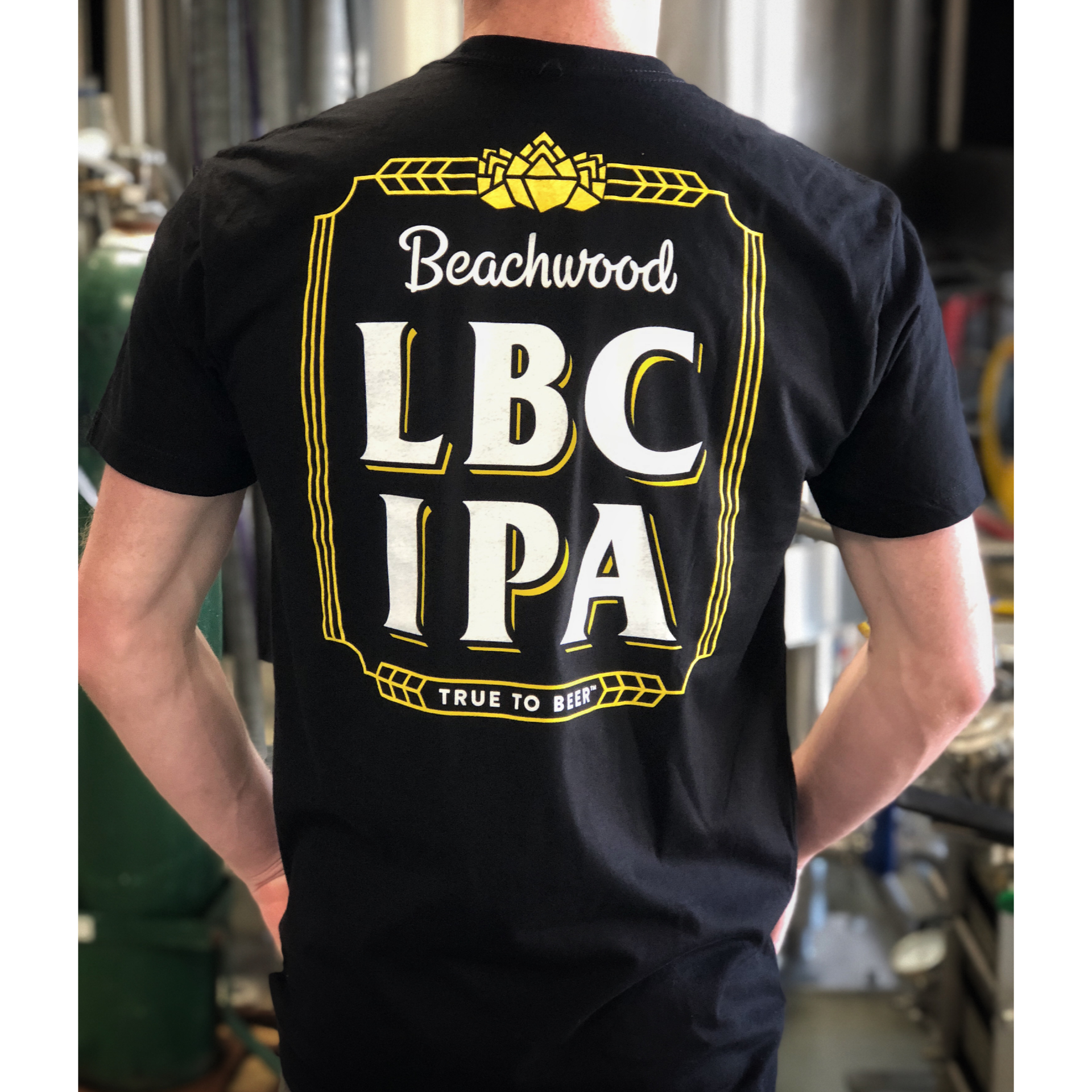 Unisex black LBC IPA t-shirt, with main artwork on the back and the LBC logo on the front left chest.